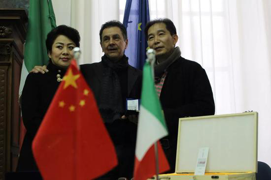 王爱君先生(右一)与中法交流协会会长侯玉霞女士(左一)以及莱切美术学院院长Andrea Rollo先生(中)合影
