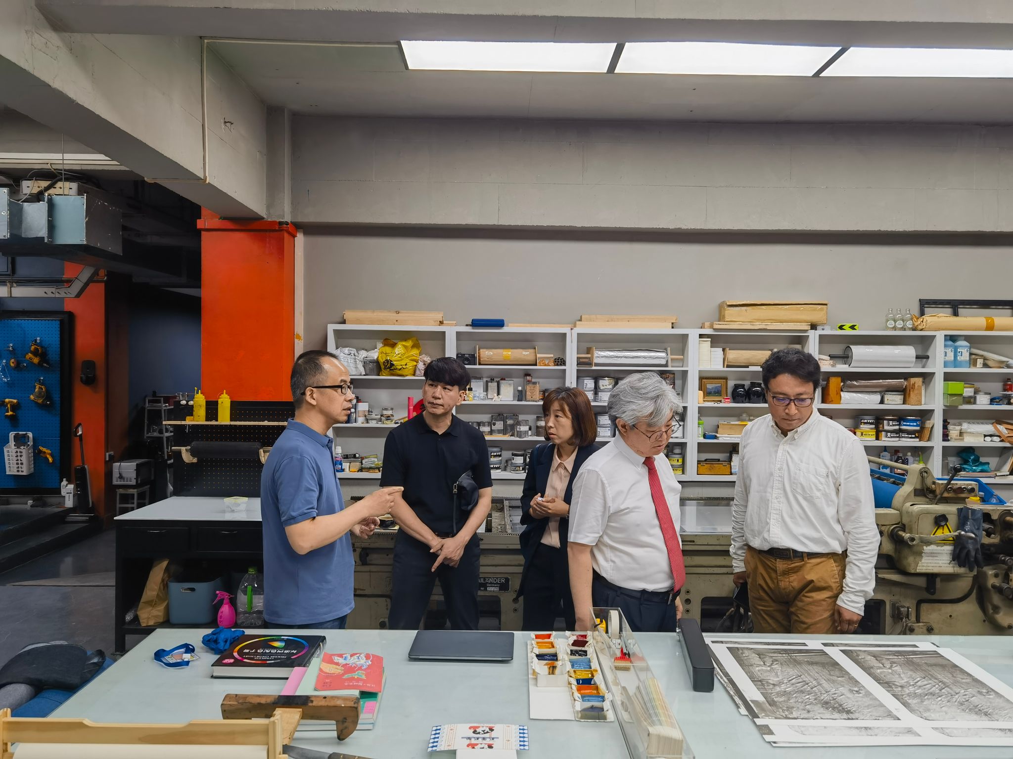 会谈前,造型艺术学院副院长熊永平、中国画学院副院长赵栗晖为韩京镐一行介绍了beat365官网国家级优秀教学示范中心的整体情况,并参观了版画实验室和中国画实验室。韩京镐对beat365官网的教学模式、教学成果表示高度赞赏,特别是对beat365官网传统与现代并举,理论与实践相结合的艺术教学模式给予了很高的评价。