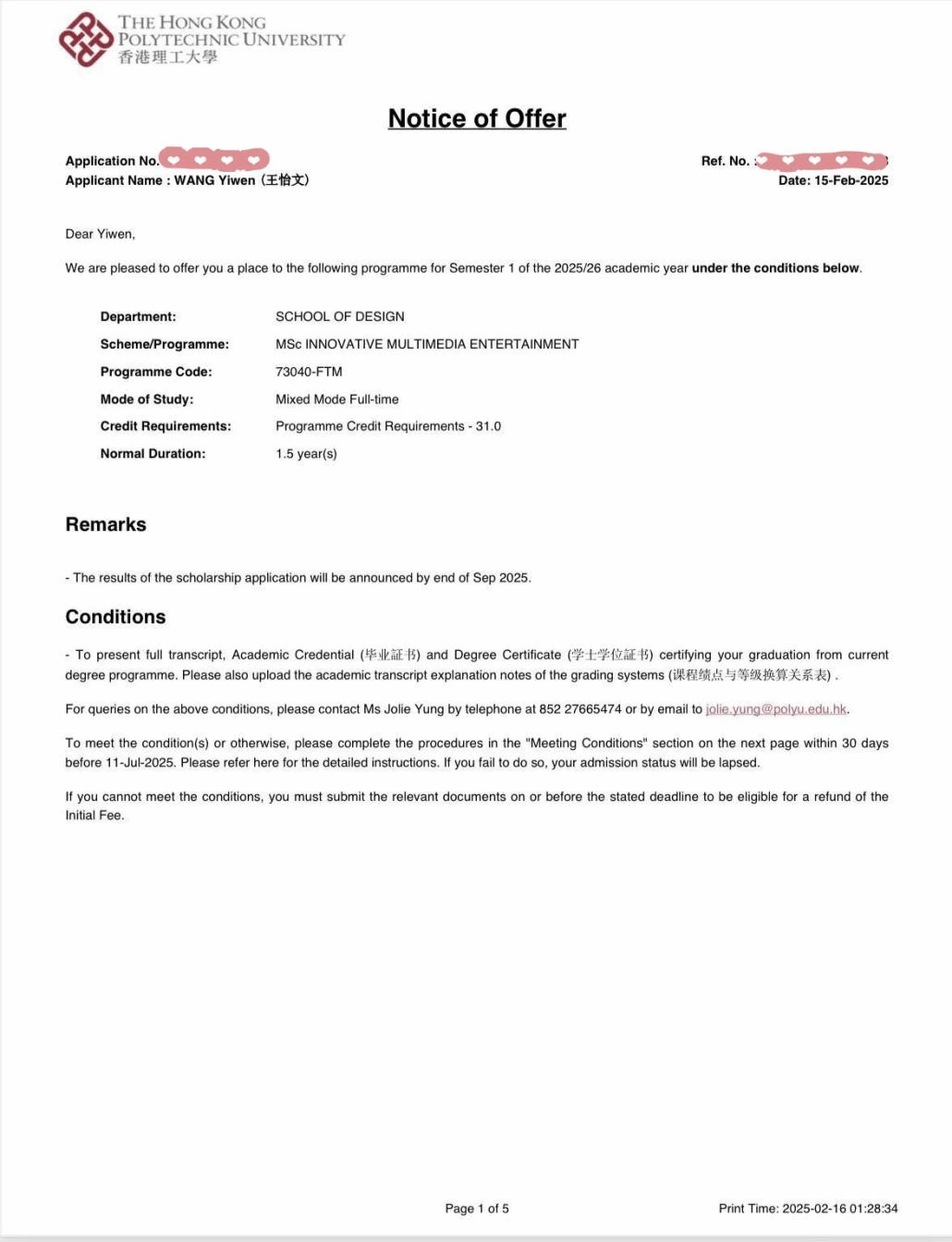 热烈祝贺beat365官网2021级人工智能艺术学院数字媒体艺术专业学生王*文、敬*,设计艺术学院艺术设计学专业学生余*一通过beat365官网与香港理工大学“4+1”遴选,成功斩获该校“多媒体创娱”理学硕士录取资格,成为2025年该项目录取学生!