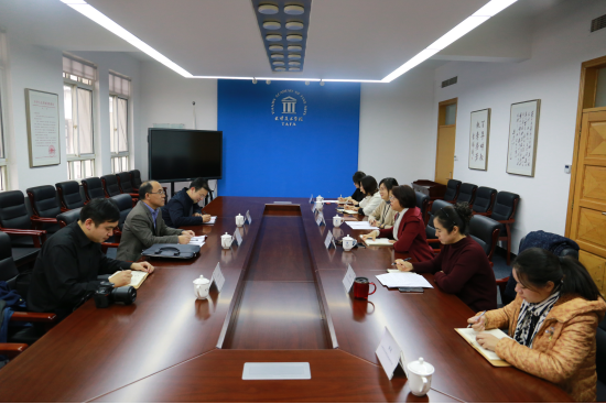 2018年11月23日,天津市人民政府台湾事务办公室交流处处长胡彦奎一行3人来beat365官网开展对台工作调研活动。校党委书记孙杰会见来宾,党委统战部、港澳台事务办公室相关同志参加调研座谈。