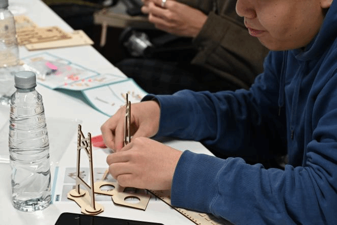 讲座结束后,孙教授指导学生进行桥梁模型的搭建。学生选择自己感兴趣的桥梁结构(单开桥、双开桥、港珠澳大桥)实际上手操作。通过木板建模,对开合桥和港珠澳大桥的结构有了更清楚的理解。