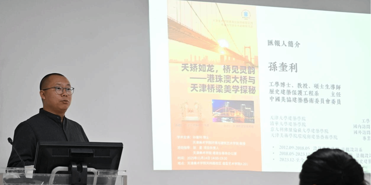 环境与建筑艺术学院孙奎利教授(孙奎利,工学博士、教授、硕士生导师,历史建筑保护工程系主任、中国美协建筑艺术委员会委员)为学生开展桥梁主题讲座。孙教授从中国古代桥梁,到现代不同地域桥梁的适配与发展,再聚焦港珠澳大桥世界首创。对中国精神在桥梁发展的历程上赋予了时代诠释,为港澳台学子生动地展示中国桥梁建设的悠久历史。