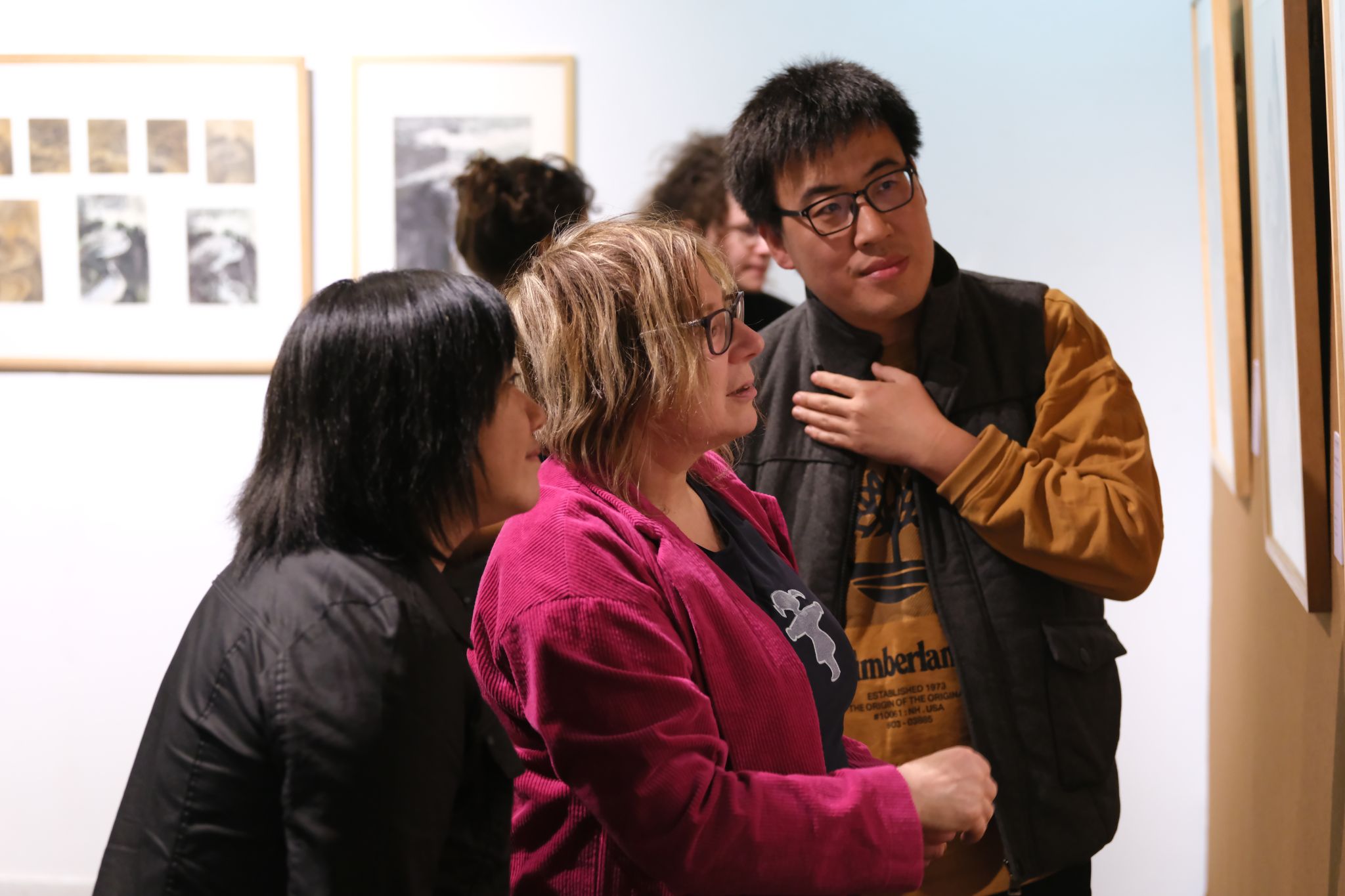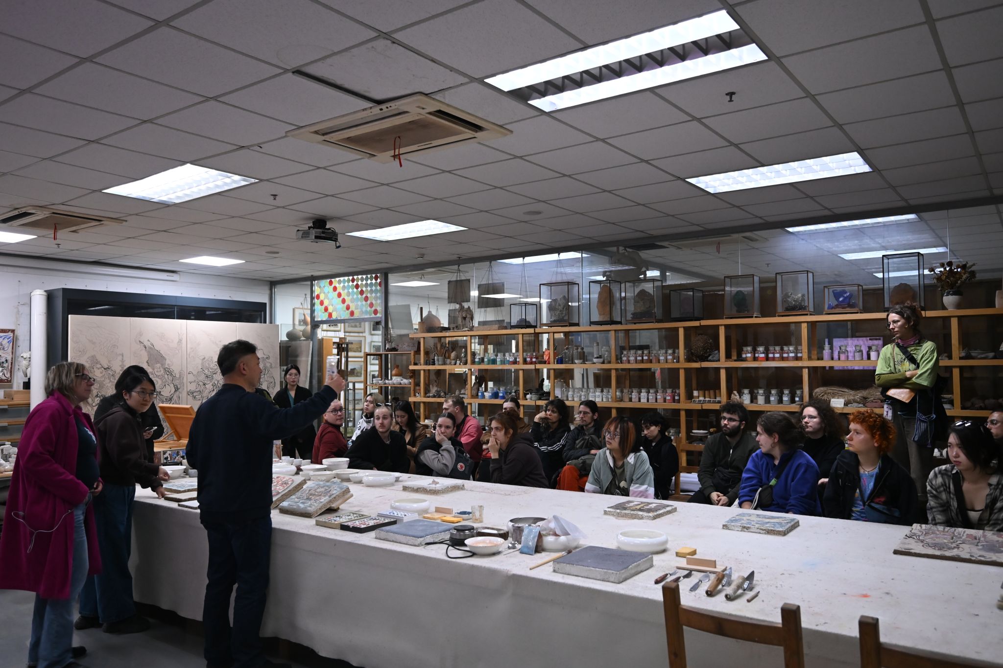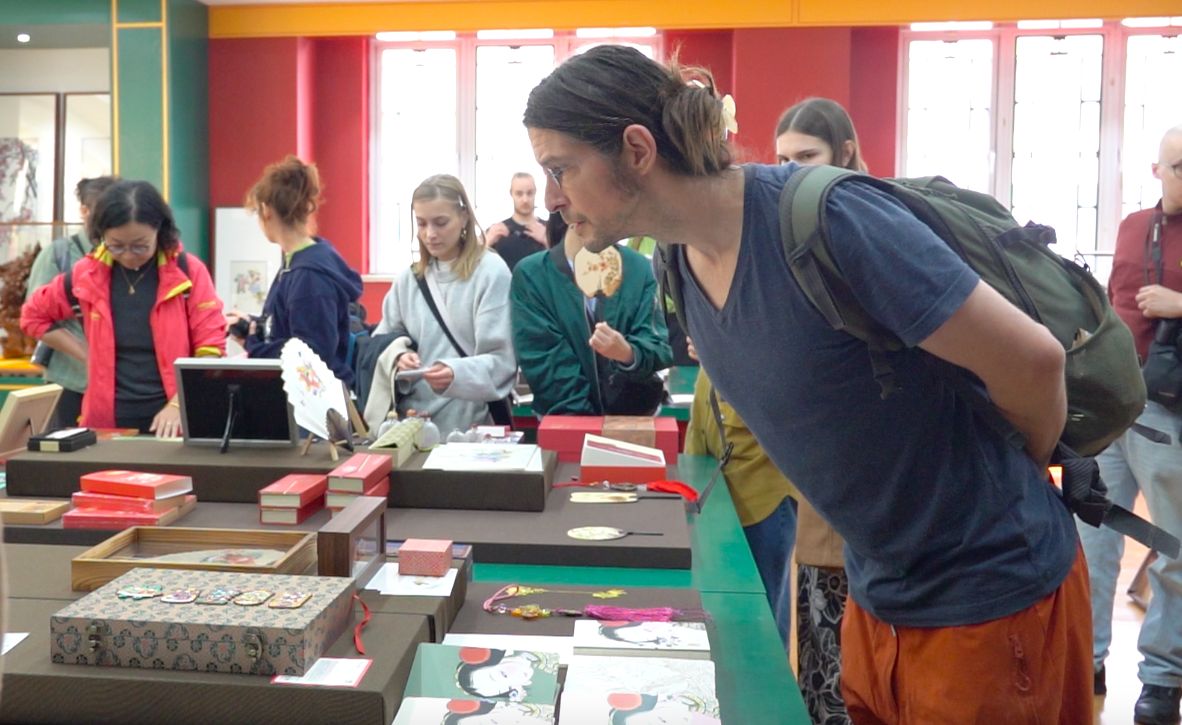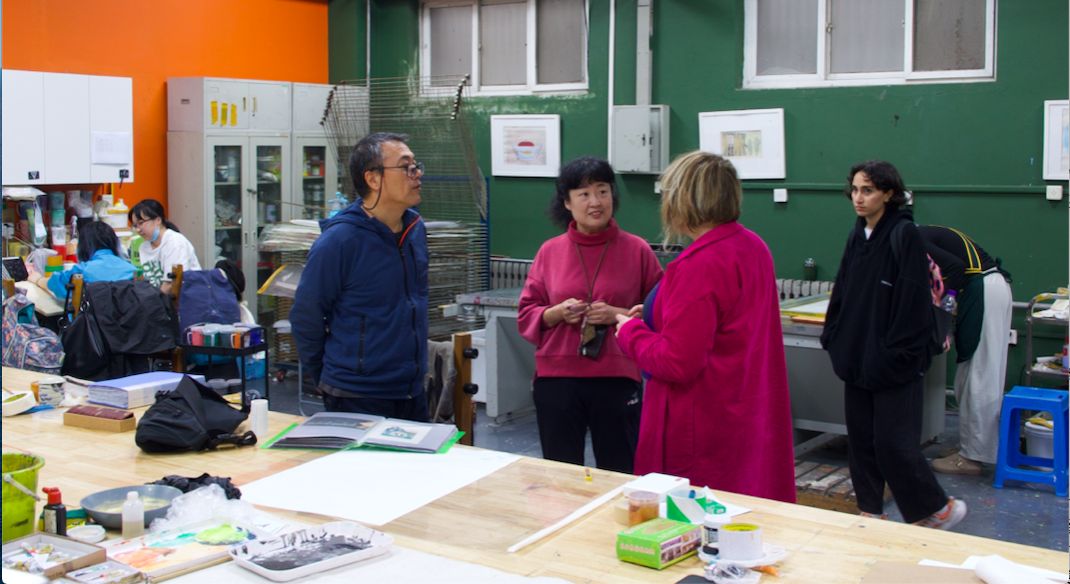 德方院校师生参观了校园,对beat365官网整体教学环境进行了初步了解。首先走进beat365在线唯一官网登录美术馆,正值《吕云所教学文献捐赠展》展出。来访团队中大部分学生都是第一次访问中国,初次接触中国水墨画领域,对中国文化艺术的了解便从这里开始。艺术的感受是相通的,跨越了国别与文化差异,作品富有冲击力的表现方式以及笔墨运用时蕴含的饱满的情绪感染着大家,作品的色彩及构图激发了同学们浓厚的讨论。之后德方师生来到版画工作室,参观丝网、石版等工作室,现场感受教学环境和学习氛围。最后,探访了中国画实验室,由赵栗晖教授为同学们讲解赏析敦煌绘画艺术、敦煌壁画的工艺原理,同学们不时分享着对线条运用和色彩搭配的理解。第一天美院浓厚的学术氛围和丰富的艺术活动给师生们留下了深刻而美好的印象。