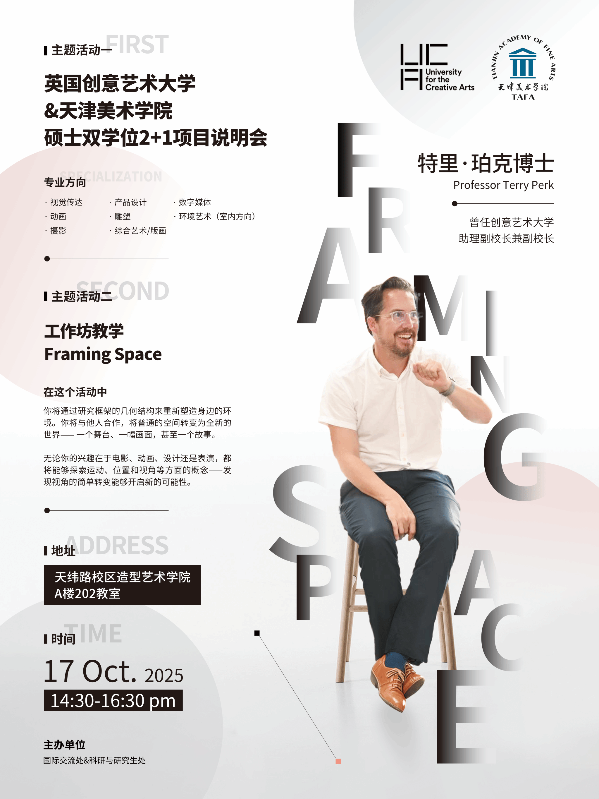 按照beat365官网与英国创意艺术大学签订硕士双学位协议,计划选拔研二在读学生赴该校进行为期1年的硕士学位修读,本项目涉及专业较多,为了帮助学生了解英国留学和英国创意艺术大学与beat365官网项目的具体内容,便于学生做好参加项目的前期准备和正确规划,英国创意艺术大学Terry Perk教授来校开展项目宣讲会,并同时举办小型工作坊教学”Framing Space”。该活动将于2025年10月17日下午2:30-4:00在造型艺术学院A楼202教室举行。