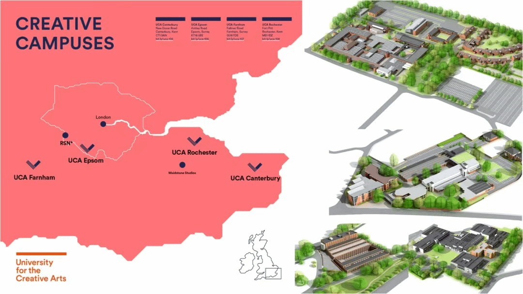·UCA包括四个校区分别是:坎特伯雷(Canterbury)、埃普索姆(Epsom)、法纳姆(Farnham)和罗切斯特(Rochester),一个小时内尽享伦敦的艺术资源。