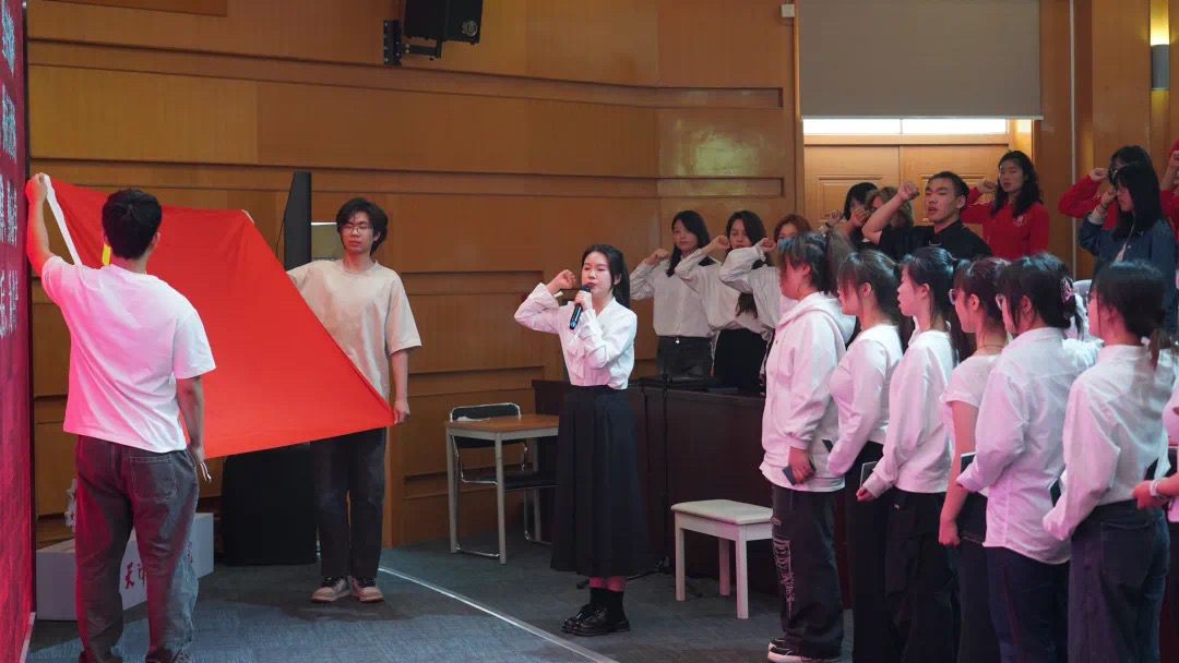 党委学工部部长、团委书记史雅宁宣读2024年第一批新发展团员名单。团员代表周乐怡领誓,全体团员重温入团誓词。会议在《光荣啊,中国共青团》中拉下序幕。