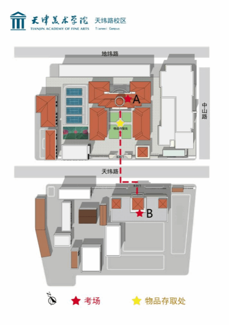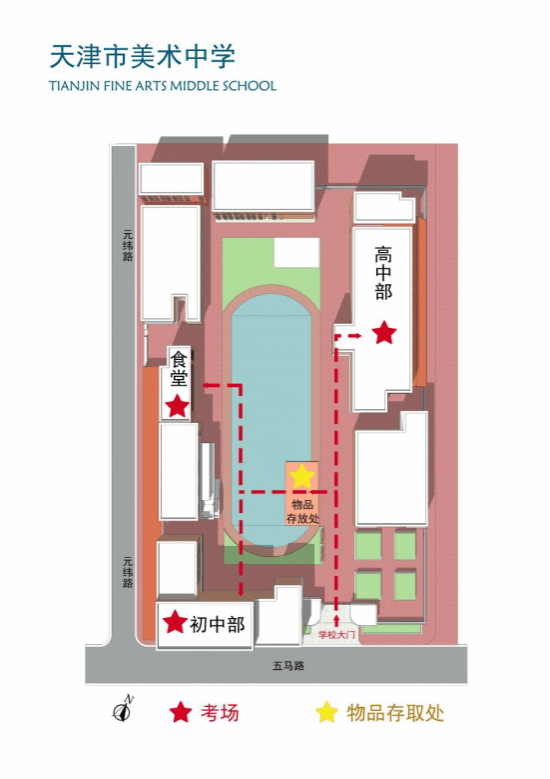 1.美术中学考点的考生从五马路校门进入,到操场物品存取处存放非考试物品;