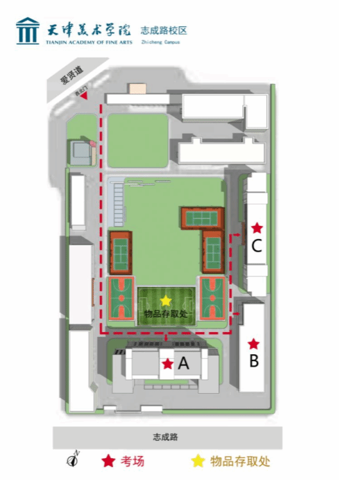 3.志成路考点的考生从爱贤道校门进入,到足球场物品存取处存放非考试物品。