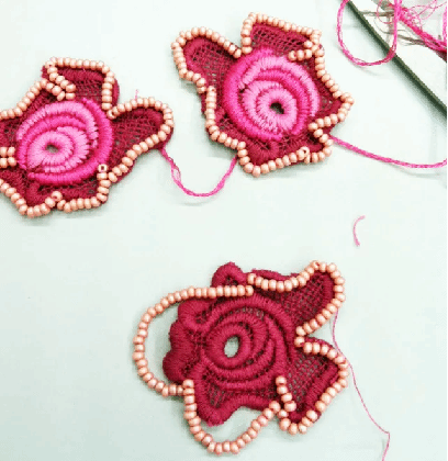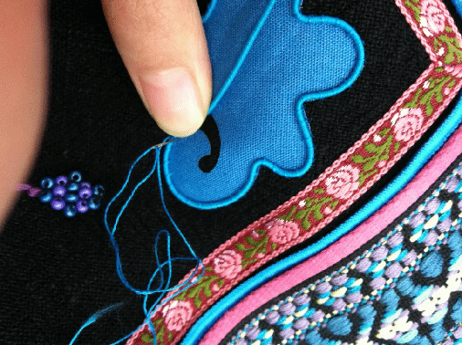 示范:布片拼接的缝制方法,包括明线缝贴、隐性缝贴、粘合缝贴、平缝、来去缝、握手缝。