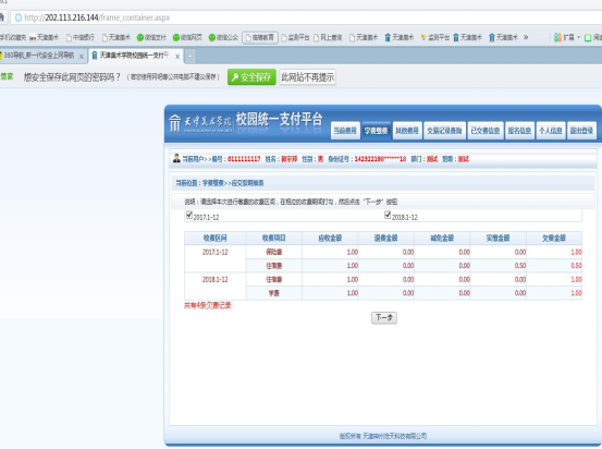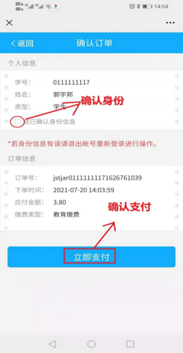 4、选择好缴费金额后点击下一步,进入本次交费确认界面。确认无误后点击下一步,进入支付界面,选择支付方式(可以选择微信支付或有银联标志的银行借记卡支付,不支持信用卡支付)。