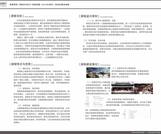 本着“学为中心”“以学定教”的教学改革核心理念,课程的建设突破传统文科思维模式,以继承与创新、交叉与融合、协同与共享为总思路,在新文科艺术创新人才培养战略中,寻求景观艺术设计教学深化改革新突破。通过《景观艺术设计》的学习大大提升学生艺术设计素养,以及在对景观设计美感鉴赏能力的基础上,提升对景观设计各要素的整合创新能力,培养多角度思考问题的能力和多种设计创意能力。逐步建立个性独立的思维逻辑方法,激发对艺术的执着追求,为今后步入景观艺术设计的殿堂,奠定坚实的知识基础。