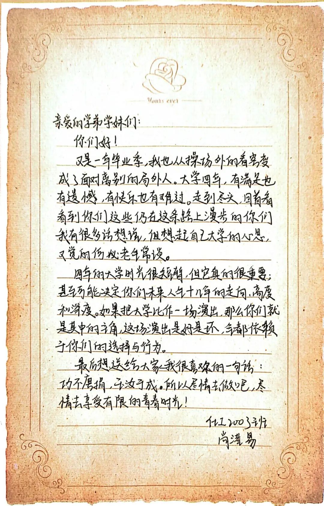 山河远阔,满眼星河;青春梦想,扬帆远航。纸短情长,继续传承,BEAT365英国官网2024届毕业学子用一封信的形式发来了他们的深情寄语......